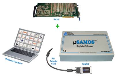Notebook computers have become a common and necessary tool for all professionals.  That is why PAC is now capitalizing on this and making it a part of your AE system.  The notebook computer, used in the AE examination as a mSAMOS Controller, contains the collected AE data.  After the AE test, the same notebook can be used to do the analysis of the data, or for preparing the report, whether on-site, in a hotel or on an airplane.  There are 2 models of mSAMOS, one AC powered only and one for AC/DC powering with or without internal battery option for up to 2.5 hours of operation on a charge with one PCI-8 card. The mSAMOS chassis is 16'' long 9.5'' wide and 2.9'' high and is comfortable sitting just below the notebook computer.